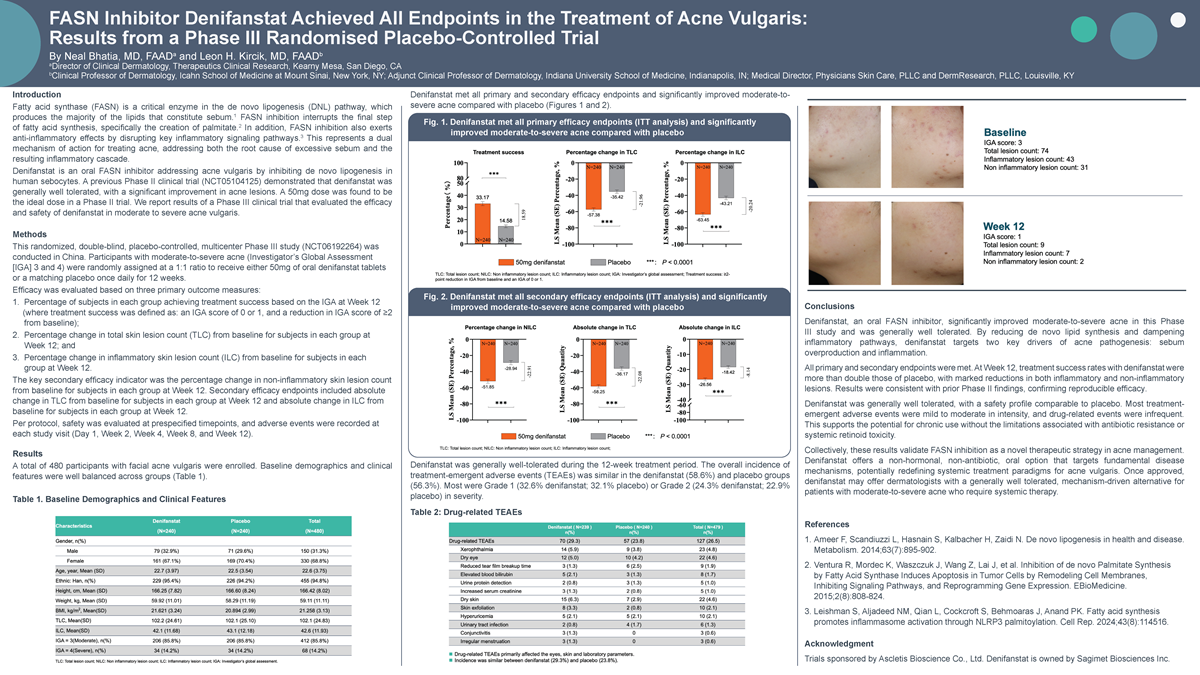 First-in-Class FASN Inhibitor Denifanstat Achieved All Endpoints in the Treatment of Acne Vulgaris: Results from a Phase 3 Randomised Placebo Controlled Trial